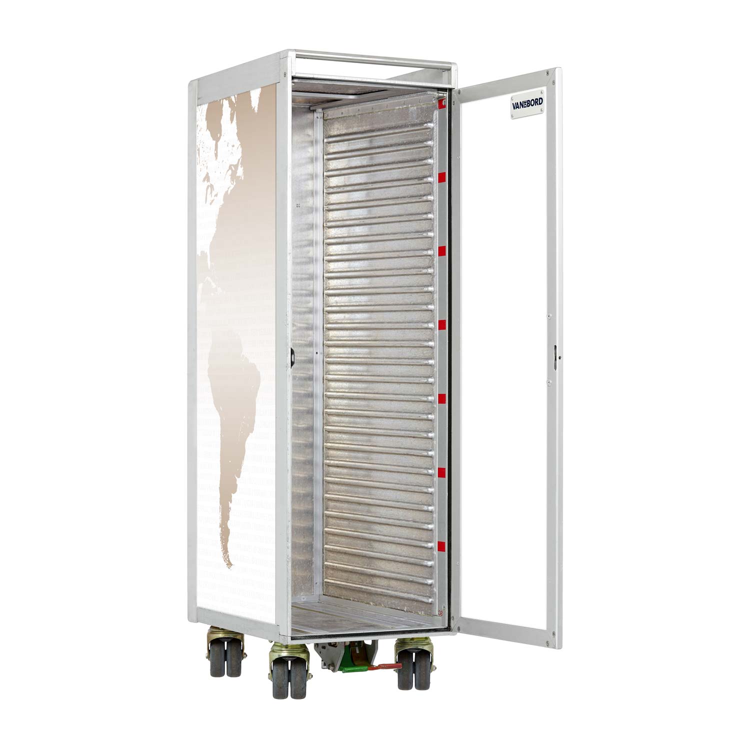 Refurbished carts are used airline trolleys that are overhauled using a meticulous process. How exactly? We go the extra mile for you: the side surfaces as well as the door sides are given new high-quality aluminum panels by us. If desired, we can insert acrylic glass into the door. Right after that, we apply the design to the airline trolley, either by laminating, direct print, or using a high-quality powder coating. The original patina on the aluminum frame, lock, wheels, and interior remains untouched. Simply divine, isn't it?
