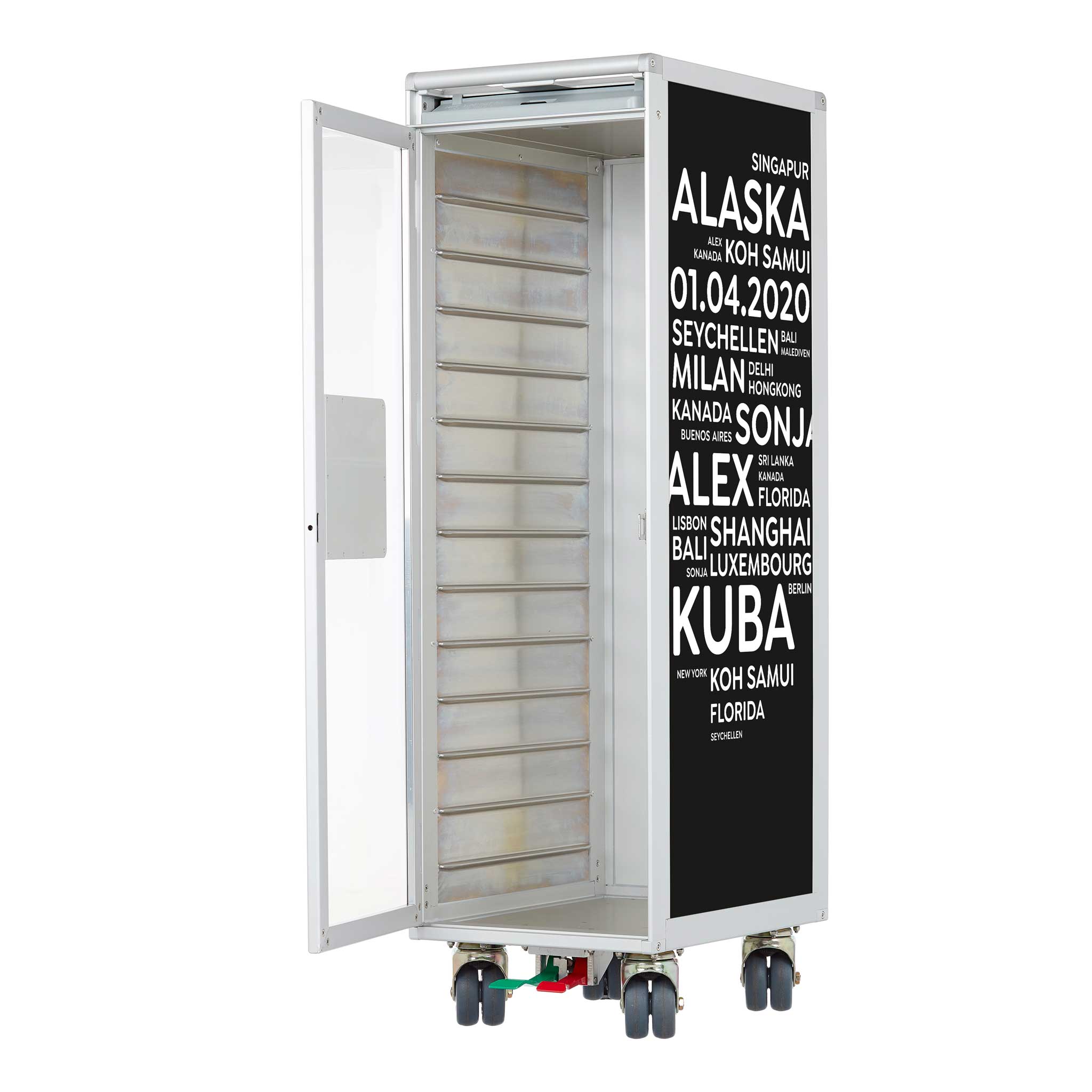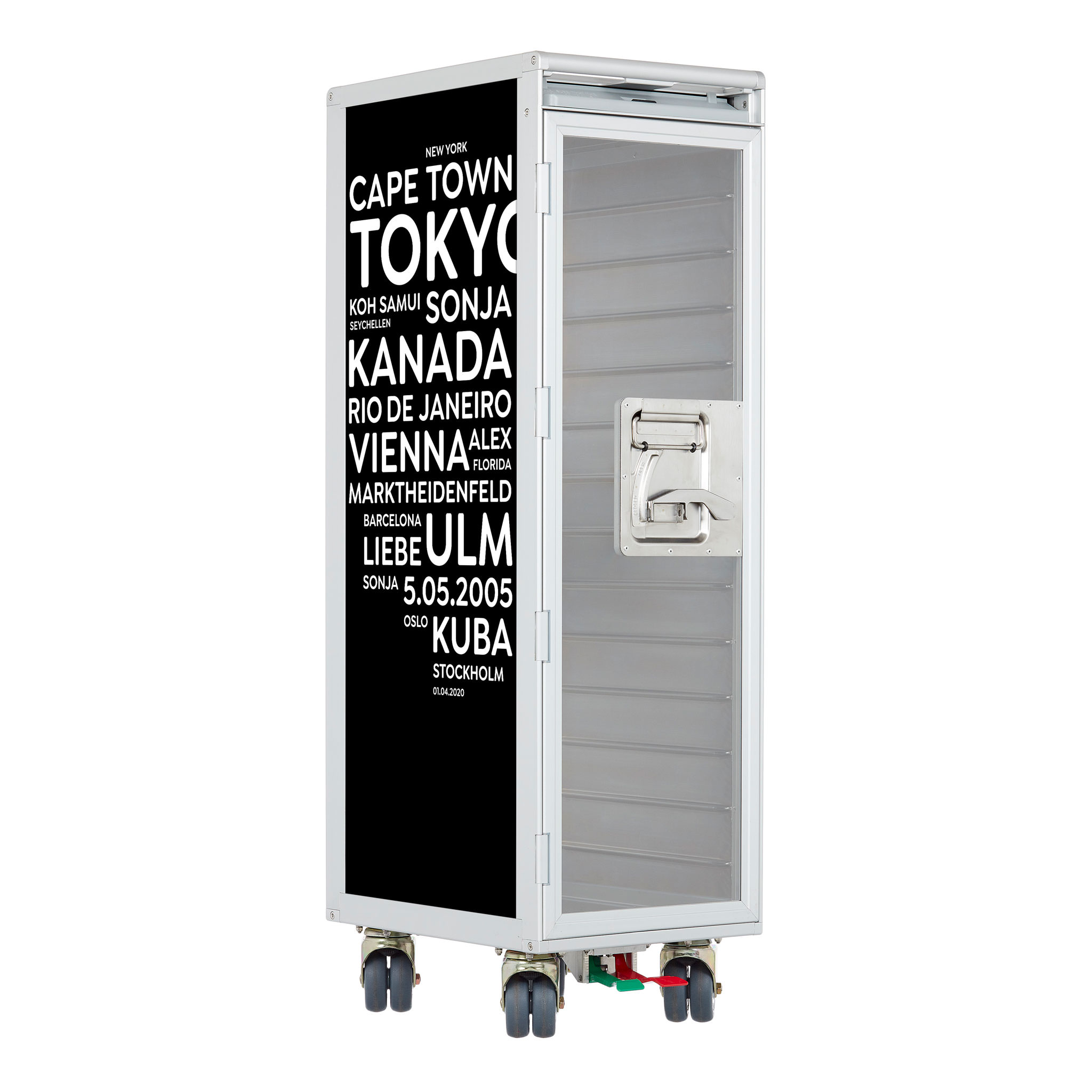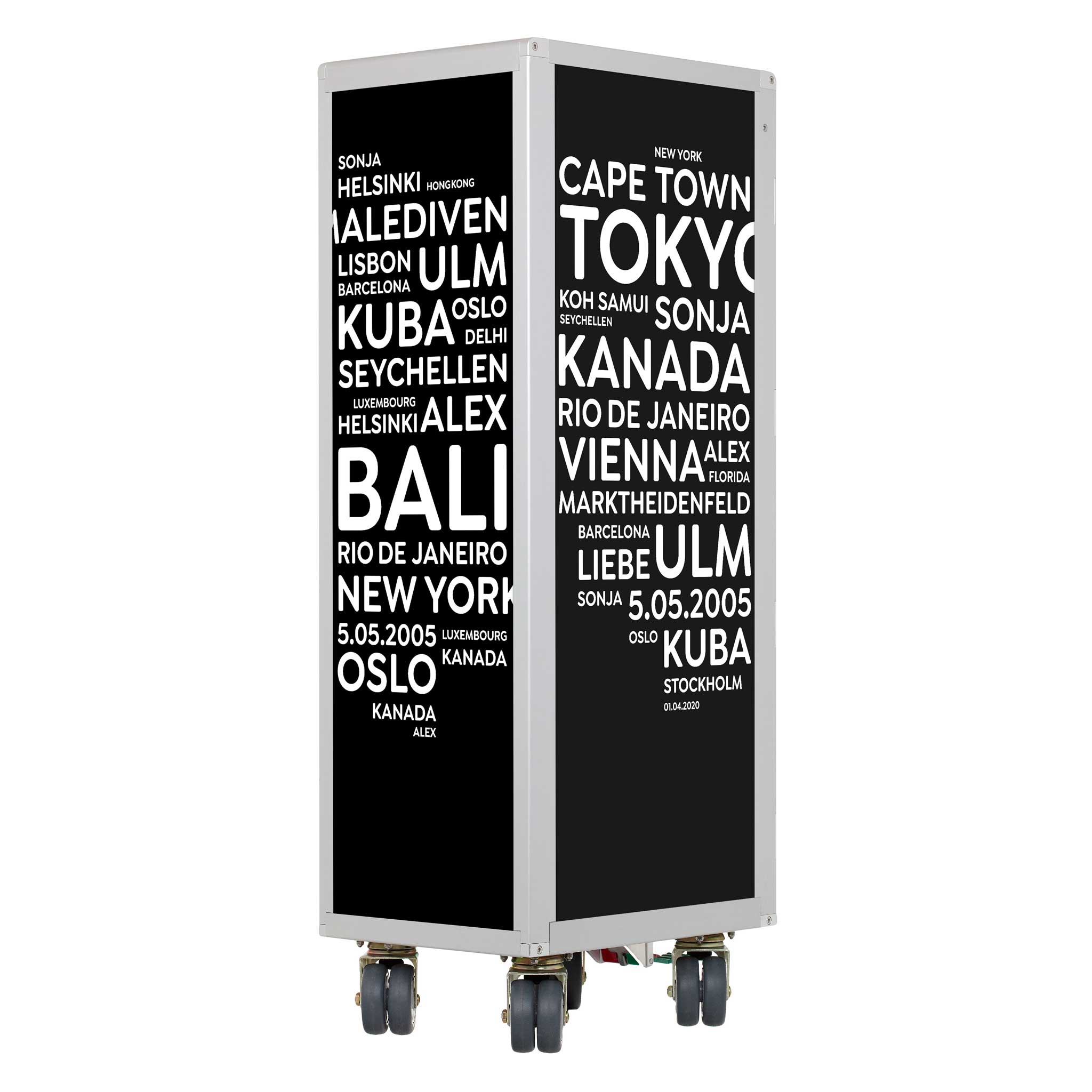 Made for you. Individually designed aircraft trolleys are excluded from the exchange and return policy. We specially manufacture an airplane trolley with your cities/terms for you - as a tailor-made unique item.