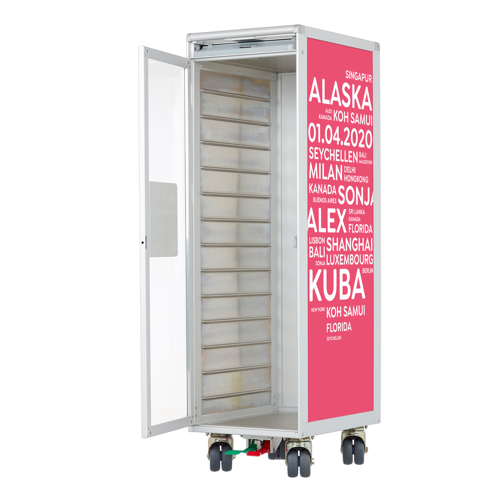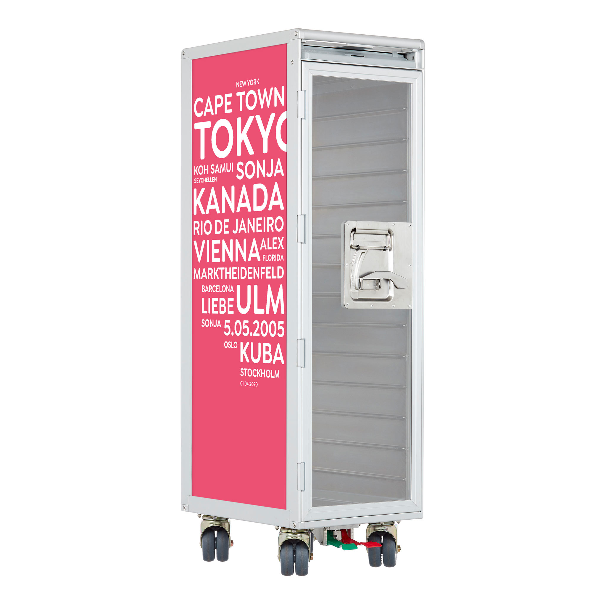 Made for you. Individually designed aircraft trolleys are excluded from the exchange and return policy. We specially manufacture an airplane trolley with your cities/terms for you - as a tailor-made unique item.