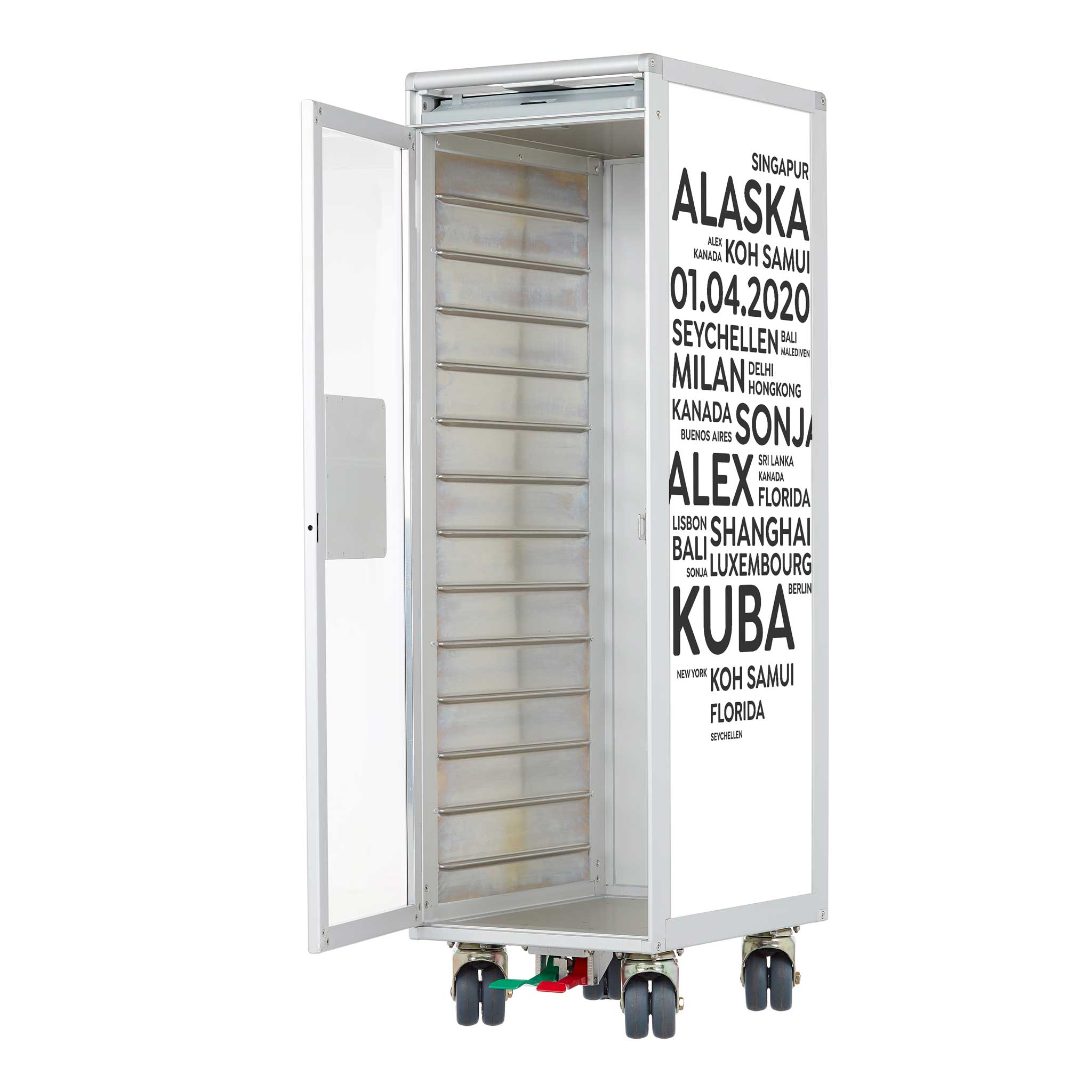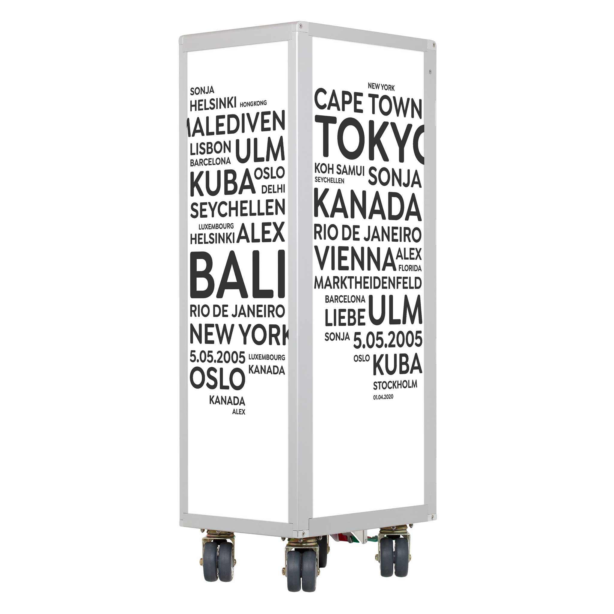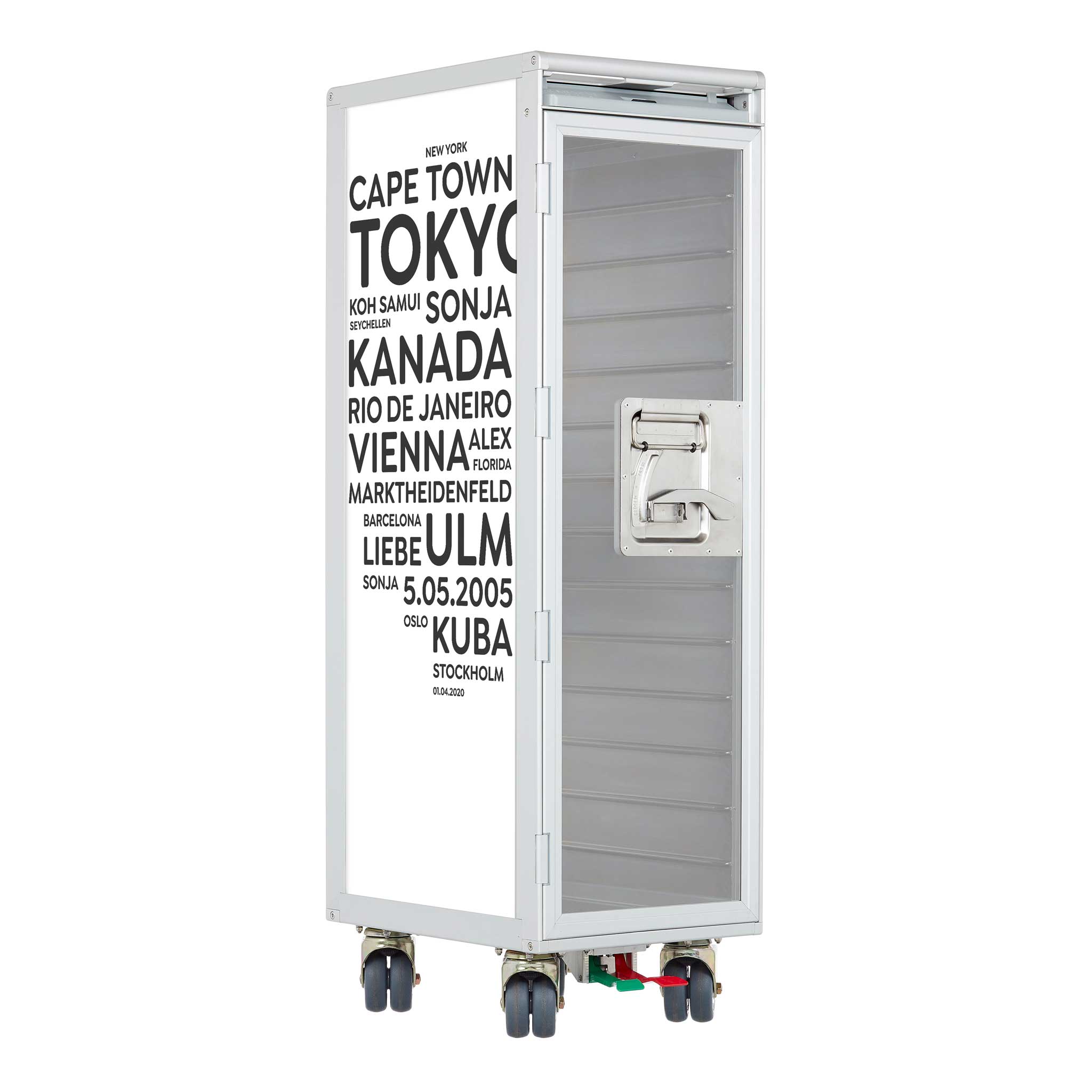 Made for you. Individually designed aircraft trolleys are excluded from the exchange and return policy. We specially manufacture an airplane trolley with your cities/terms for you - as a tailor-made unique item.