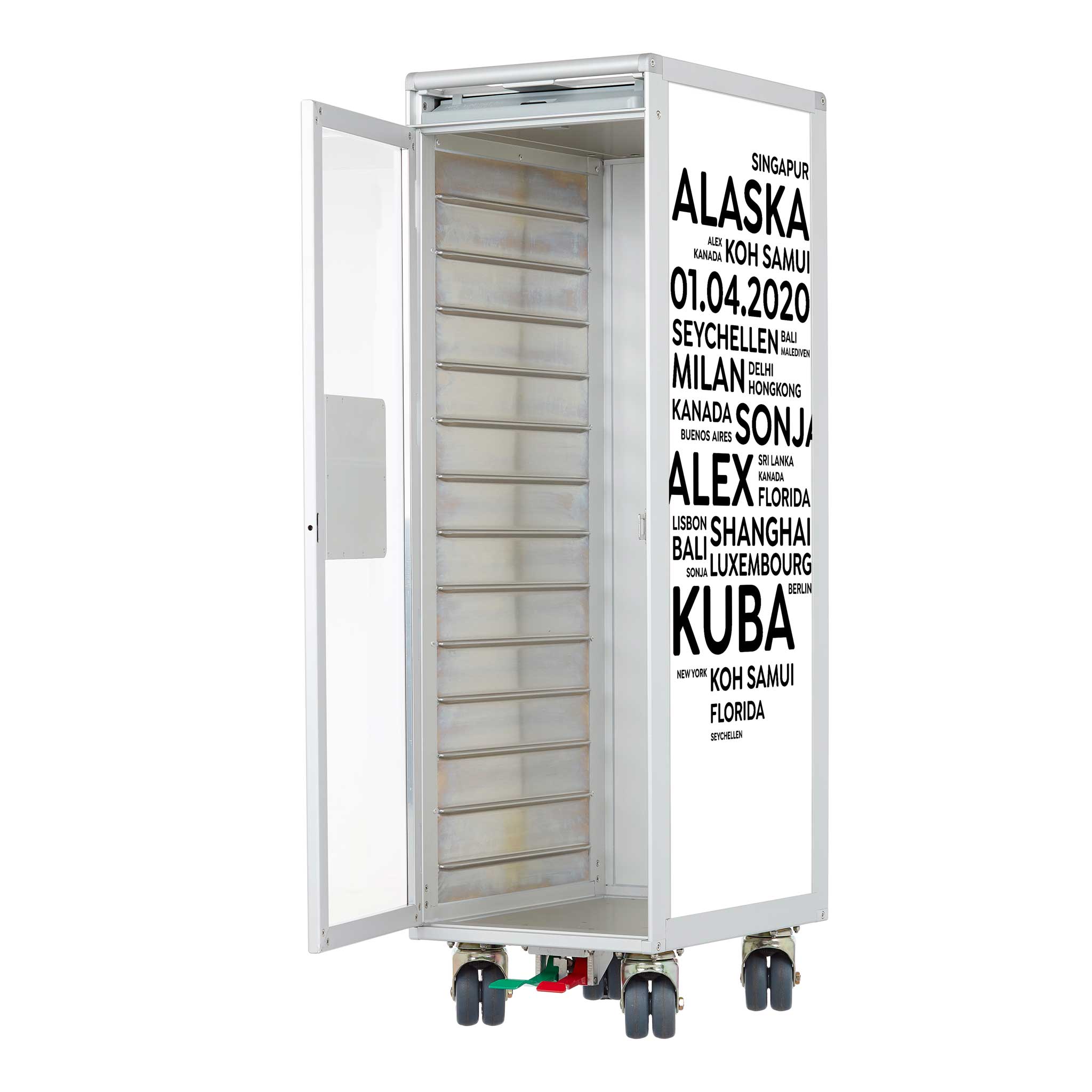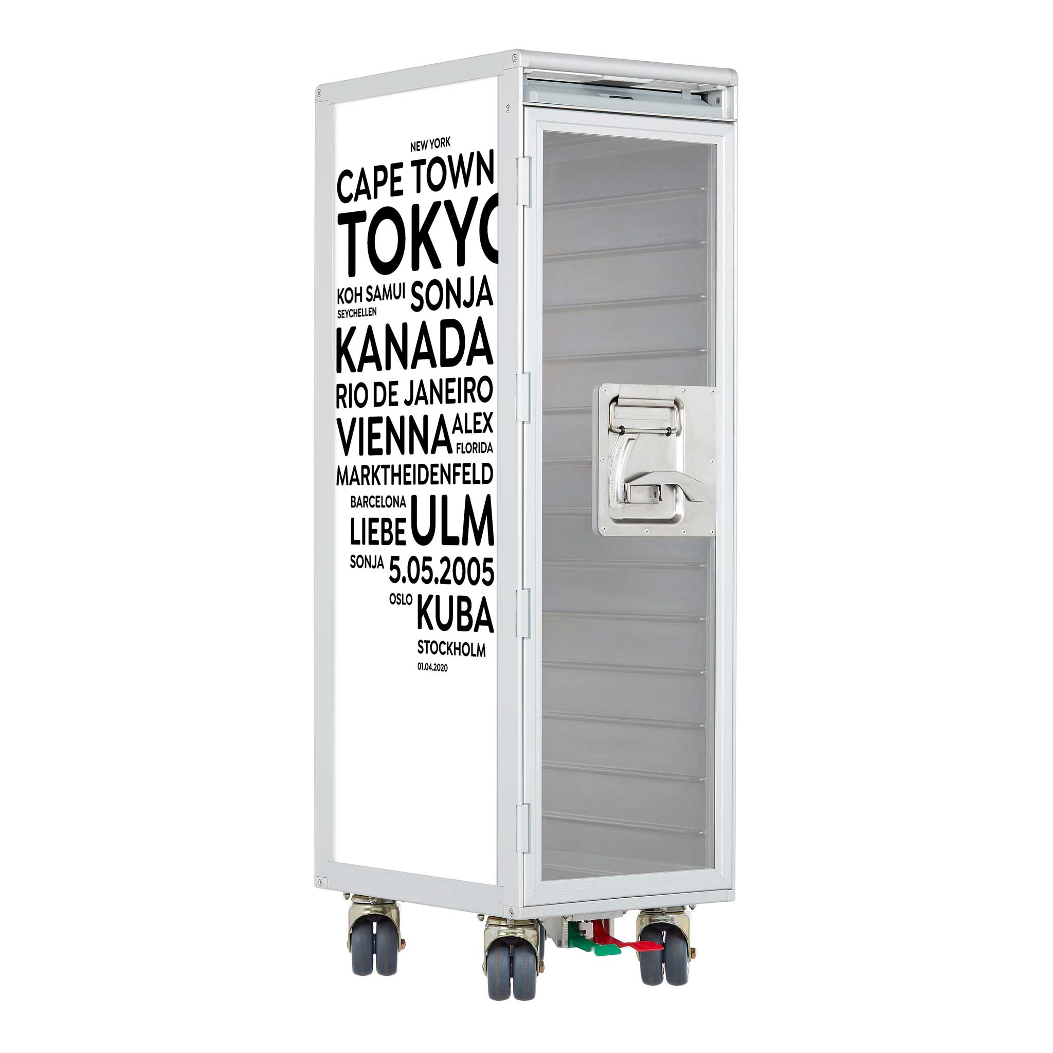 Made for you. Individually designed aircraft trolleys are excluded from the exchange and return policy. We specially manufacture an airplane trolley with your cities/terms for you - as a tailor-made unique item.