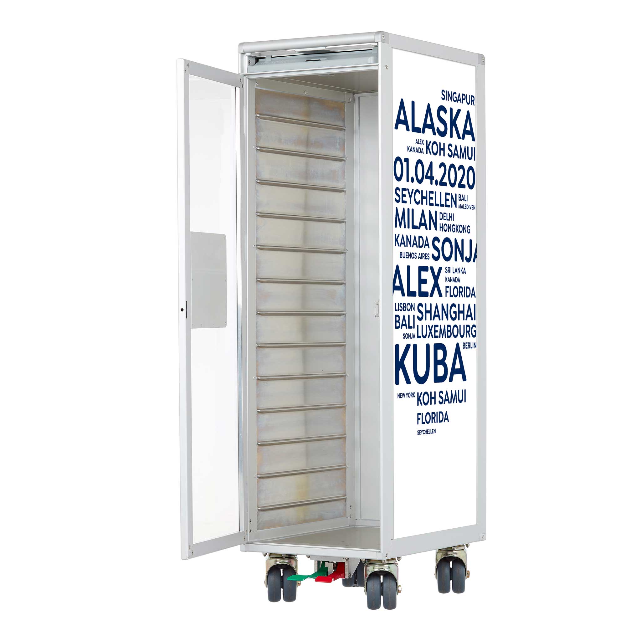 Made for you. Individually designed aircraft trolleys are excluded from the exchange and return policy. We specially manufacture an airplane trolley with your cities/terms for you - as a tailor-made unique item.