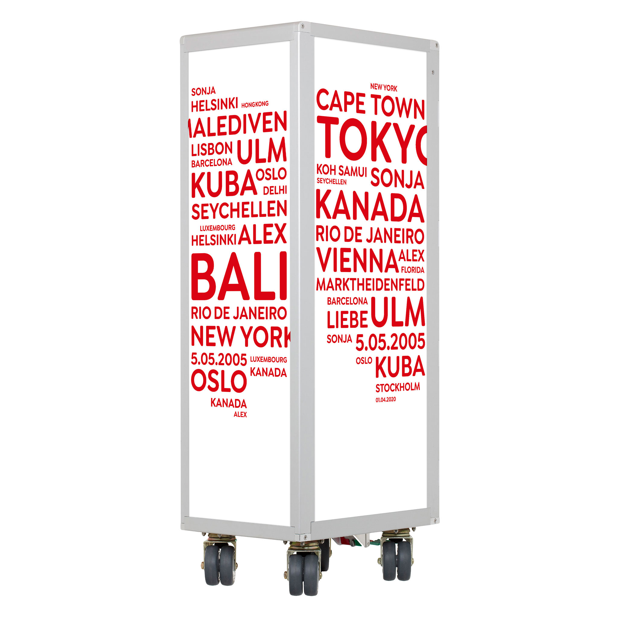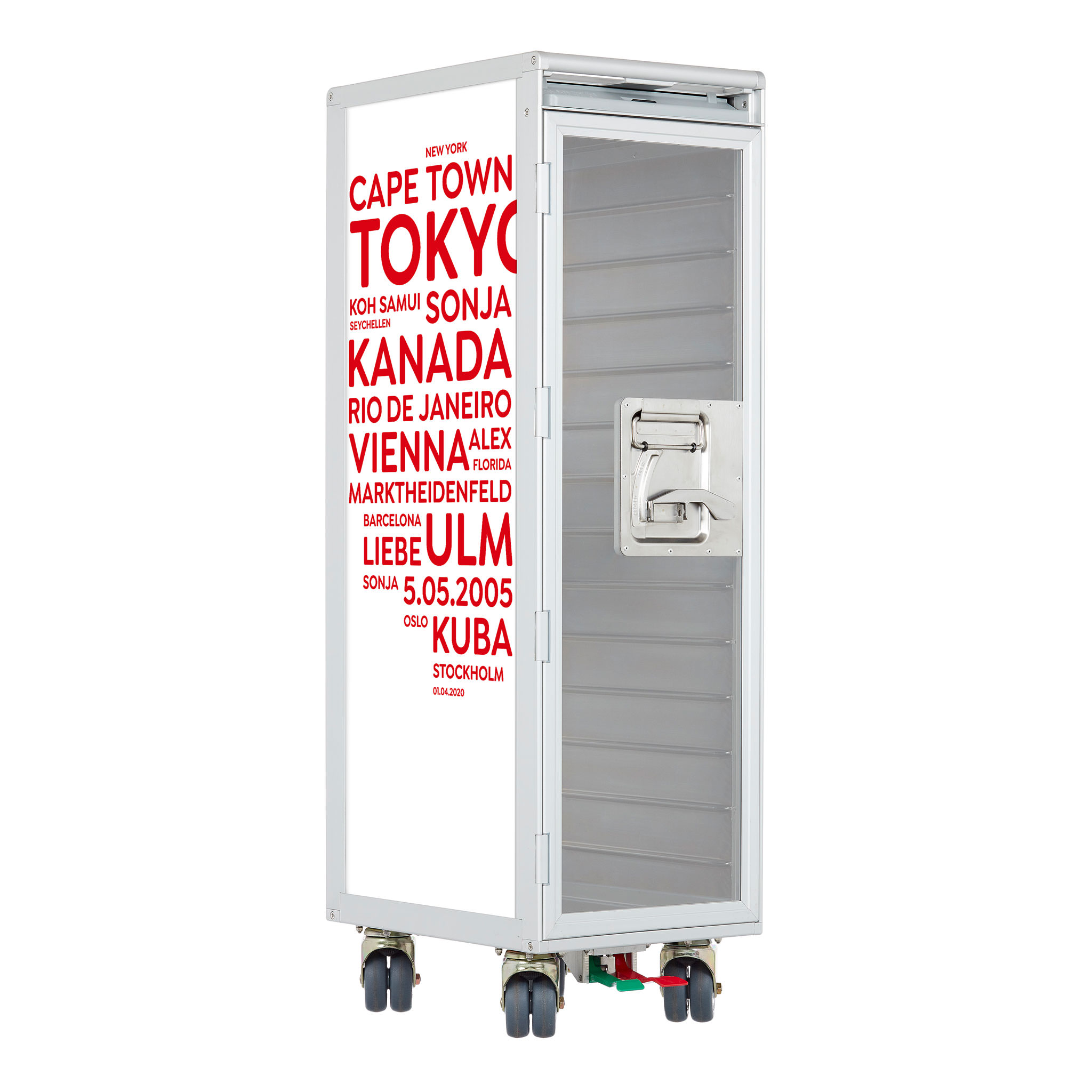 Made for you. Individually designed aircraft trolleys are excluded from the exchange and return policy. We specially manufacture an airplane trolley with your cities/terms for you - as a tailor-made unique item.