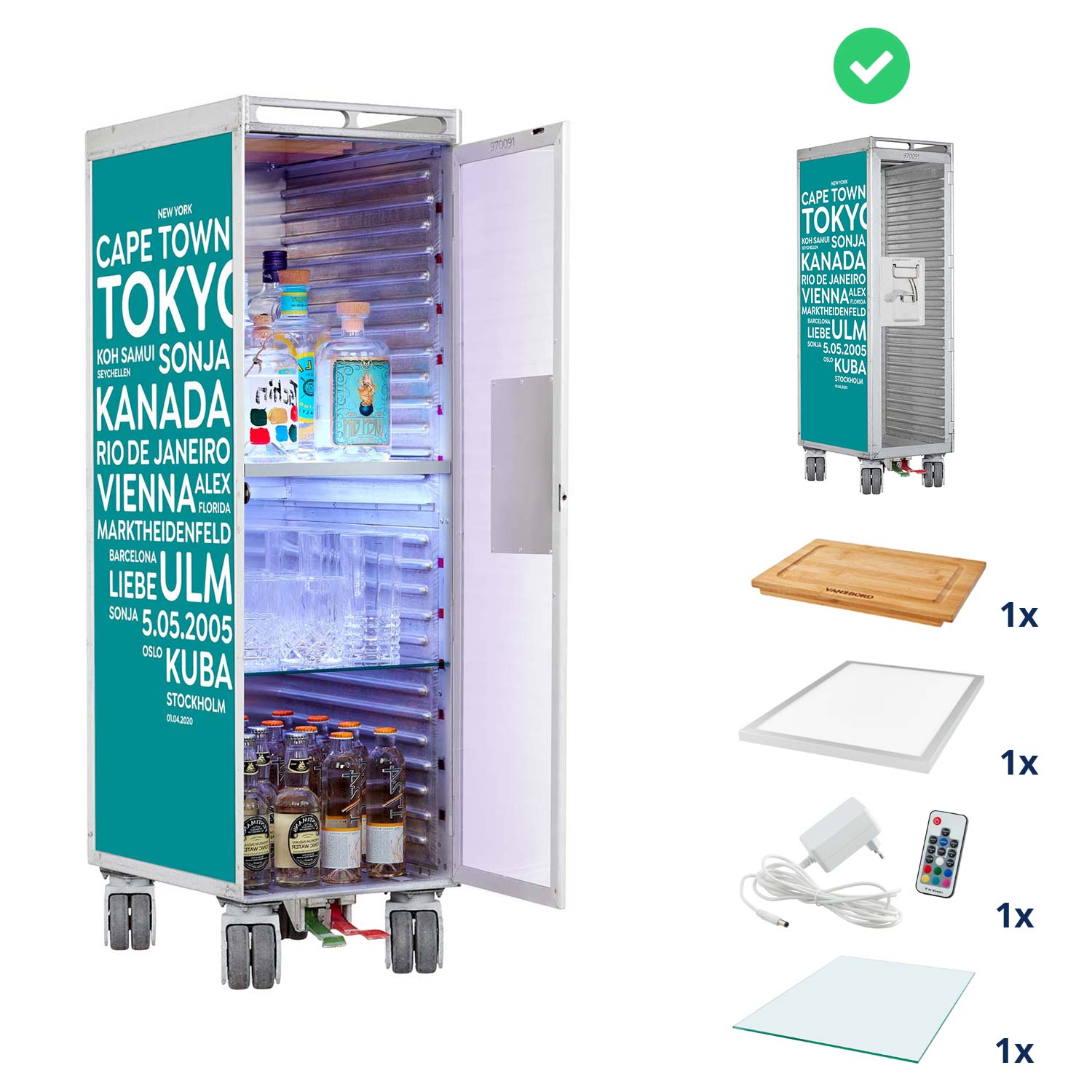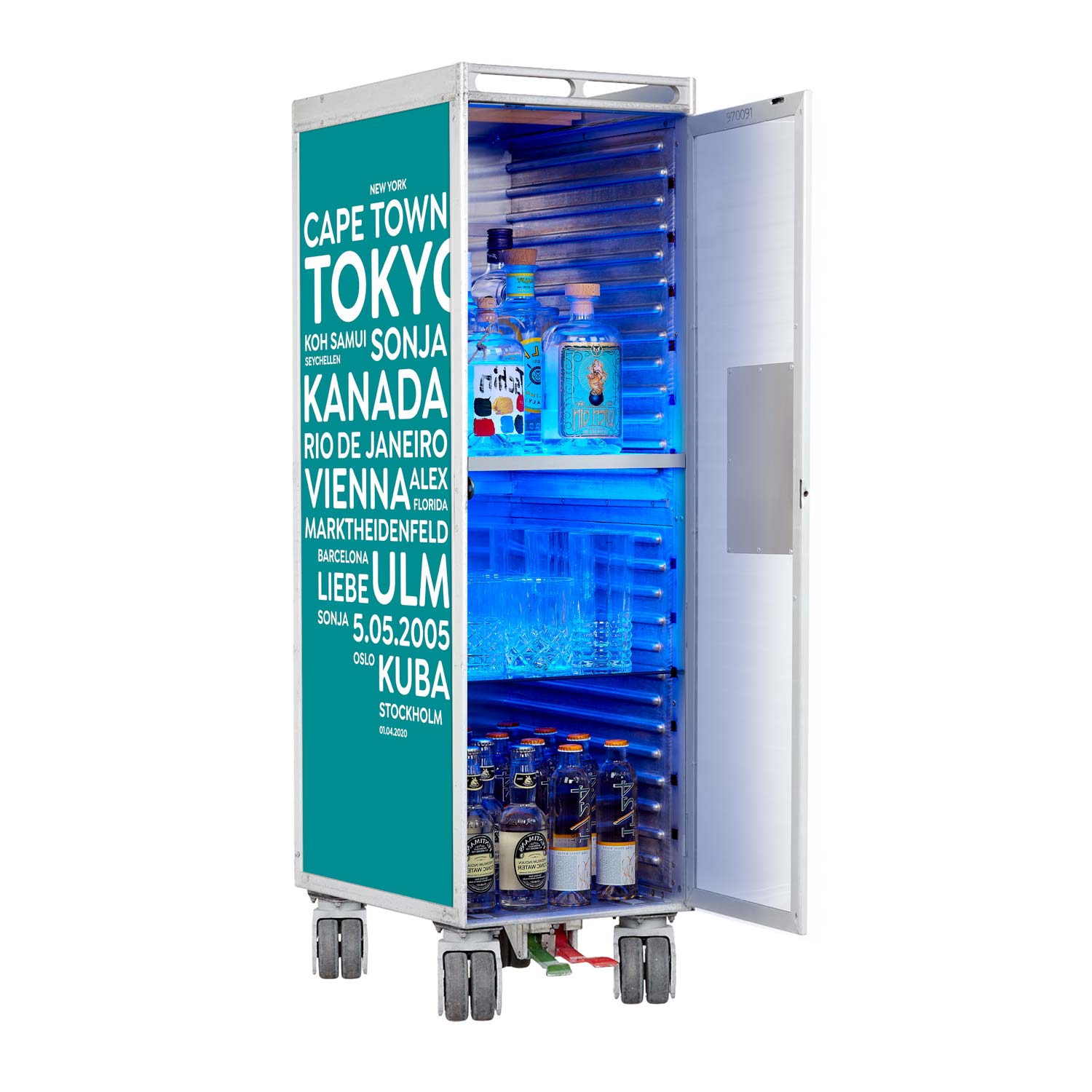 Du wählst die Begriffe/ Städte für Deine Flugzeugtrolley Bar und wir gestalten Dein City-Design.