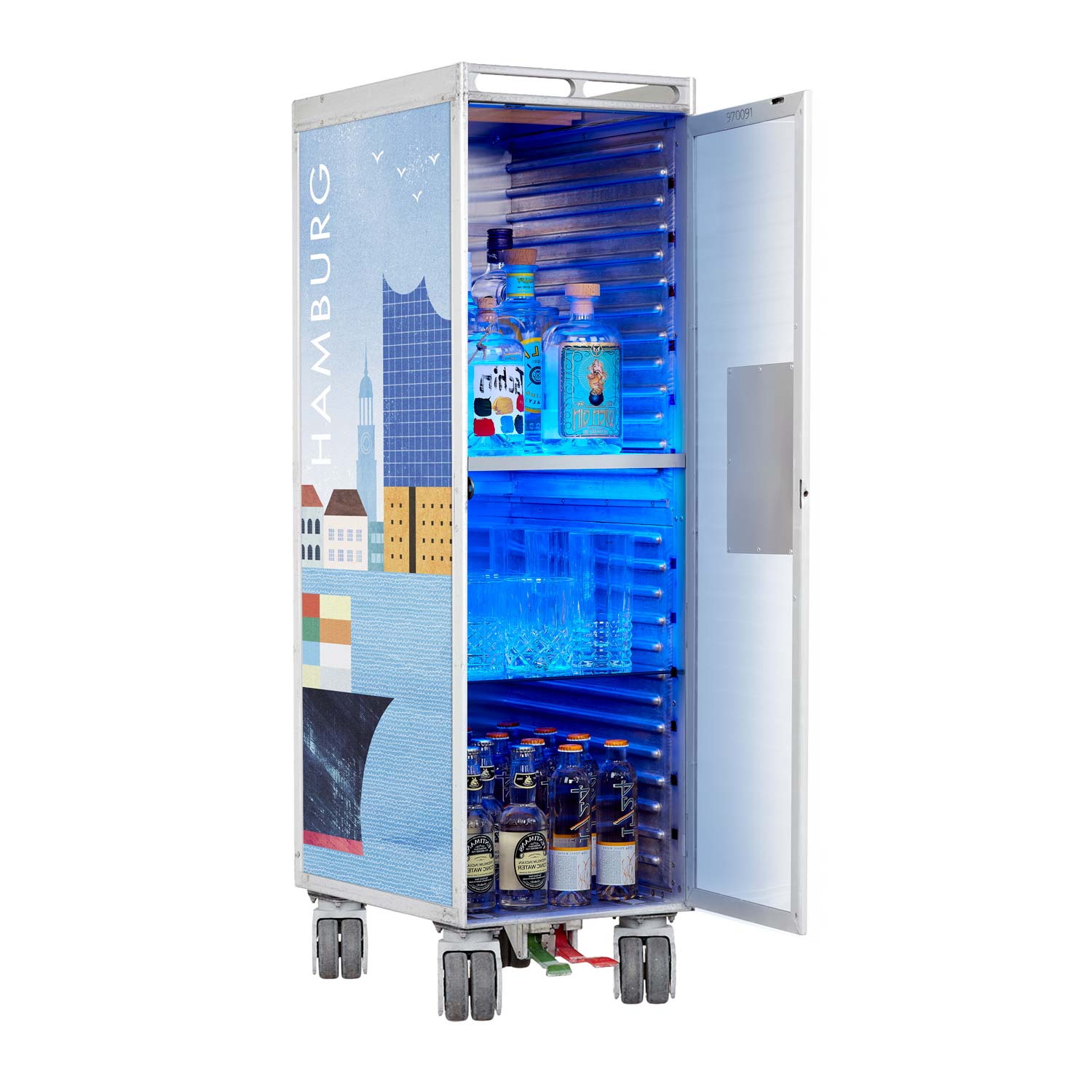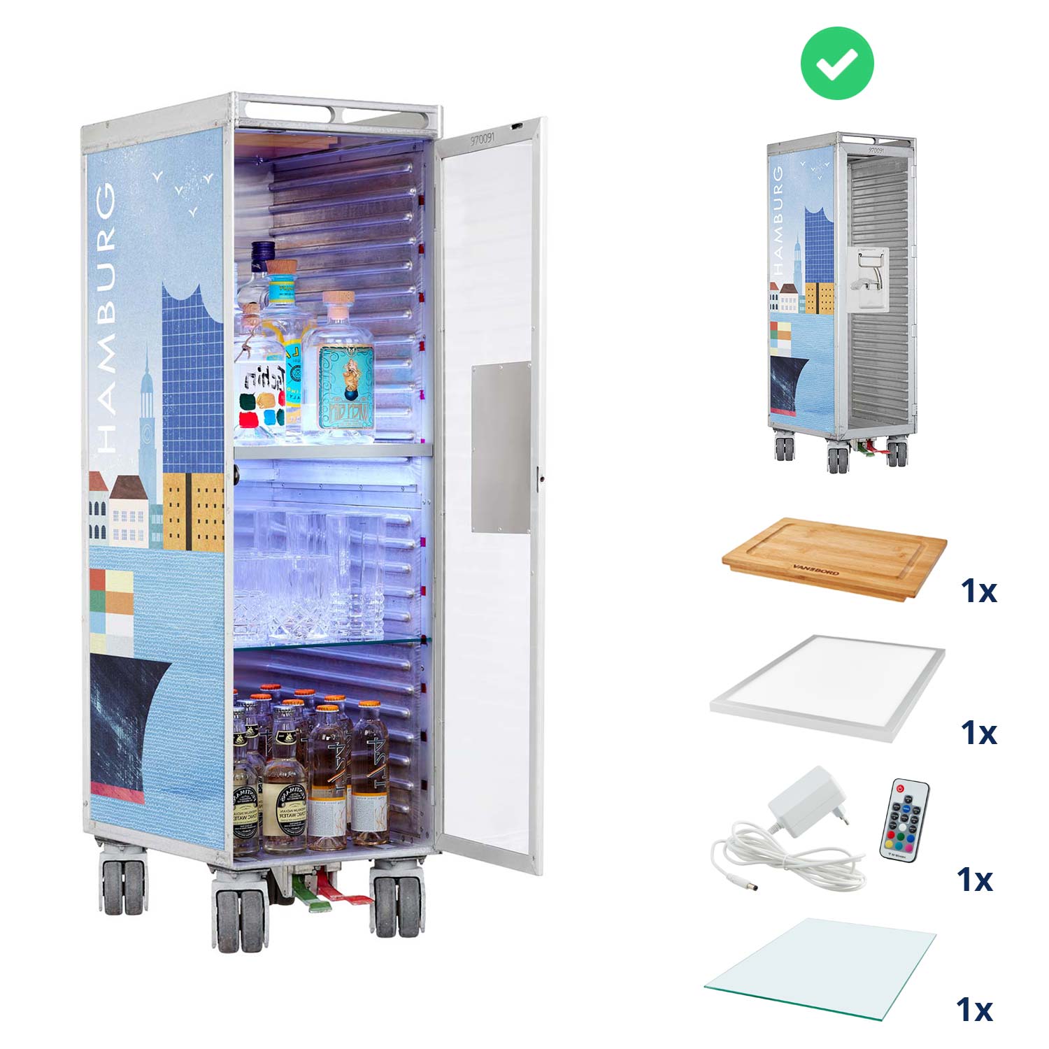Bartrolley Henry Rivers Edition Visit Hamburg inkl. LED-Leuchtfachboden, Barbrett & Fachboden aus Glas
