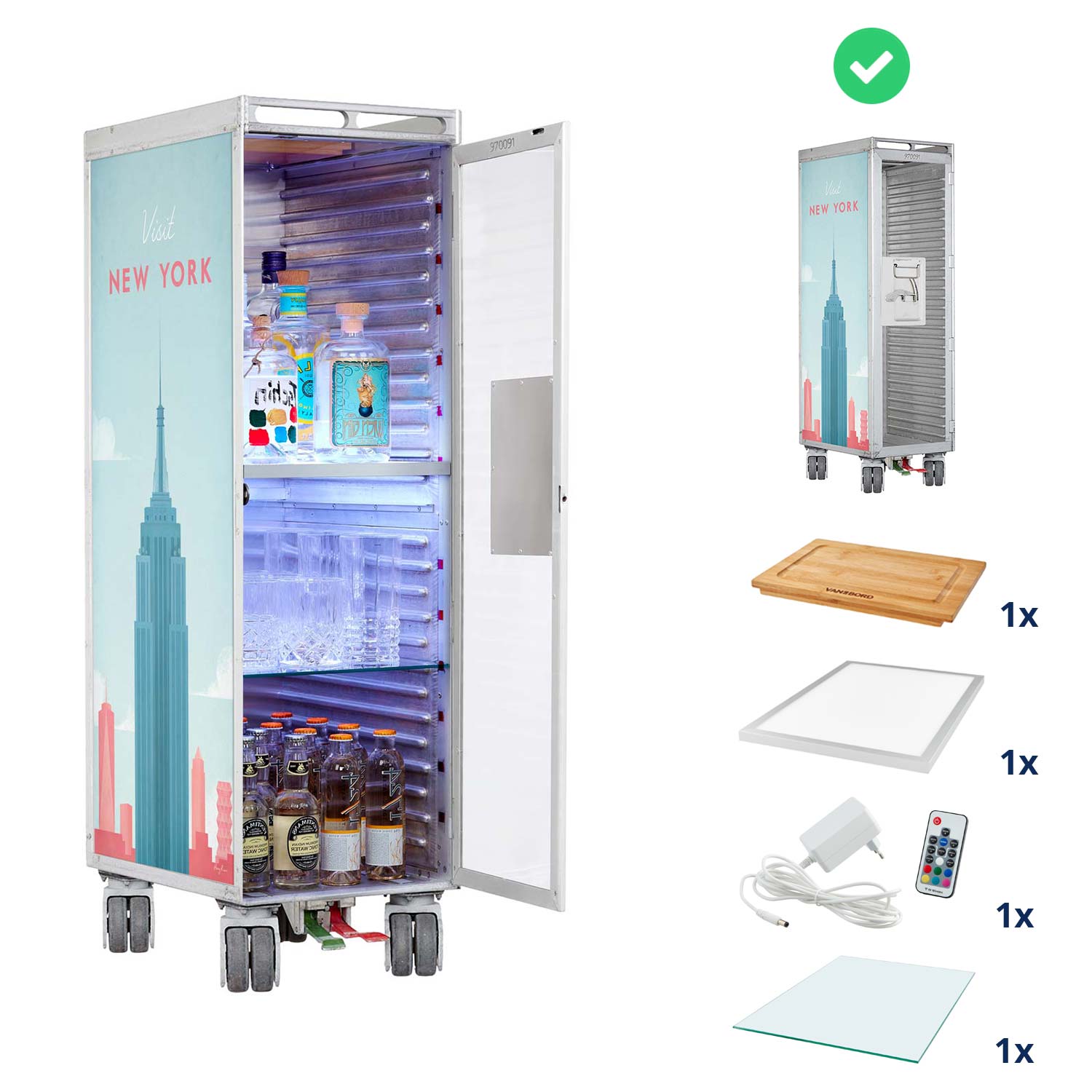 Absolut! In luftigen Höhen essentiell, besitzen alle Flugzeugtrolleys eine Isolierfunktion für Hitze und Kälte. Das ist in der Luftfahrt ein wesentliches Merkmal – da Airlines Trolleys für Speiseeis und Eiswürfel an Bord nutzen. Daher behalten auch bei dir Zuhause vorgekühlte Drinks angenehm lange ihre Temperatur. Für ein besonders cooles Erlebnis (und um deinen Trolley in eine Minibar zu verwandeln), probier's mal mit Trockeneis: Einfach online bestellen, in eine flache Alu-Schublade legen und oben im Trolley platzieren. Voilà – die perfekte Vorbereitung für dein nächstes Event mit dem Bartrolley!