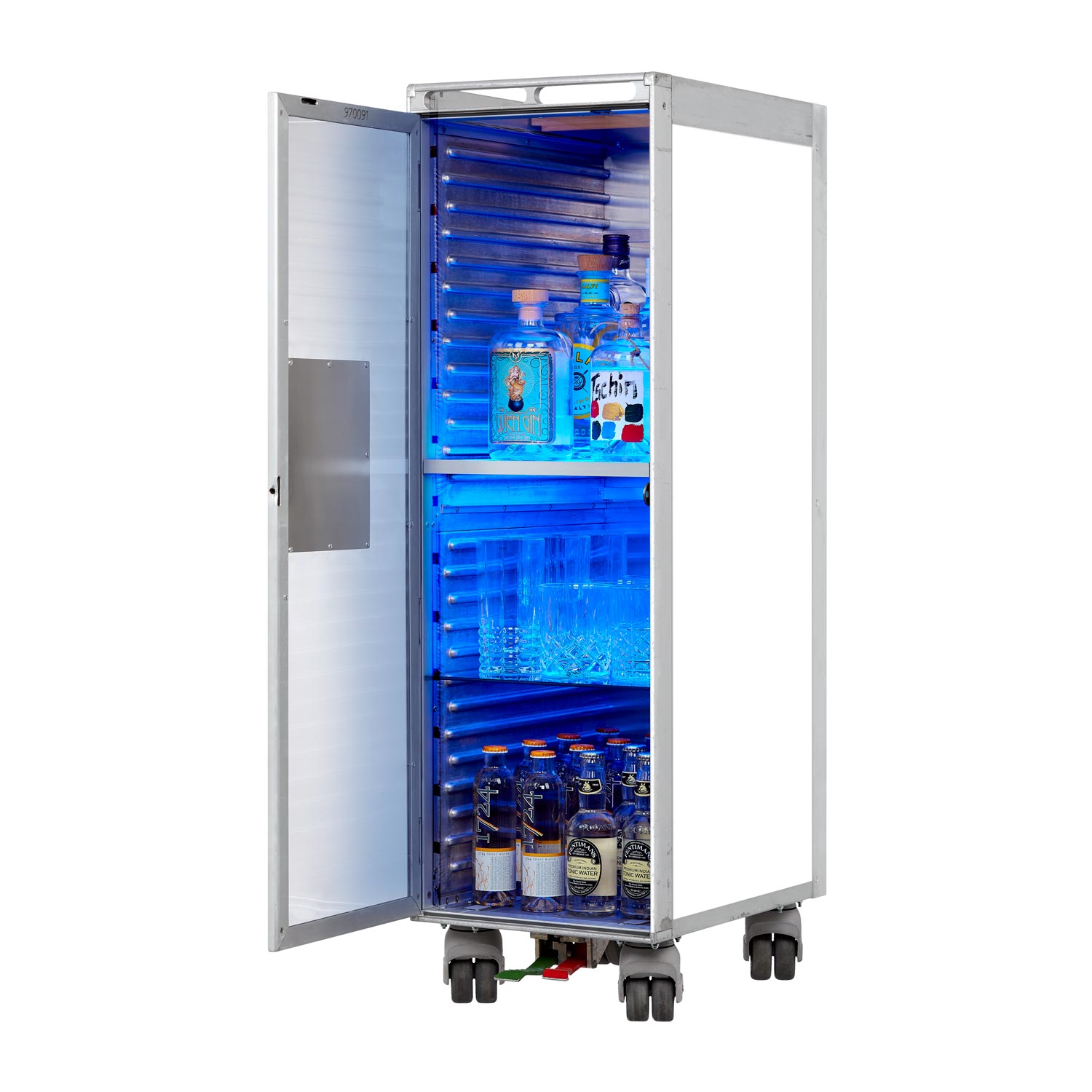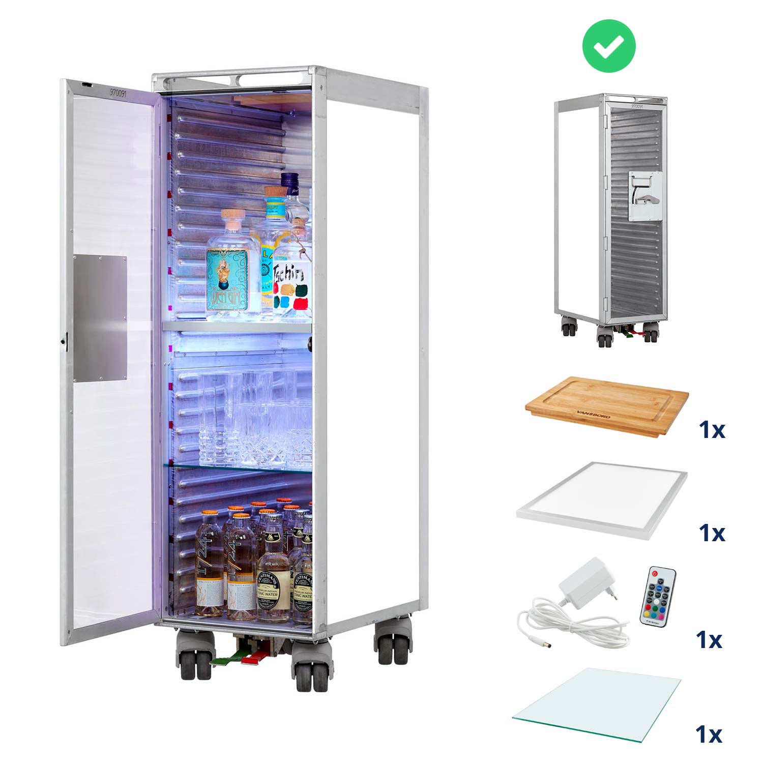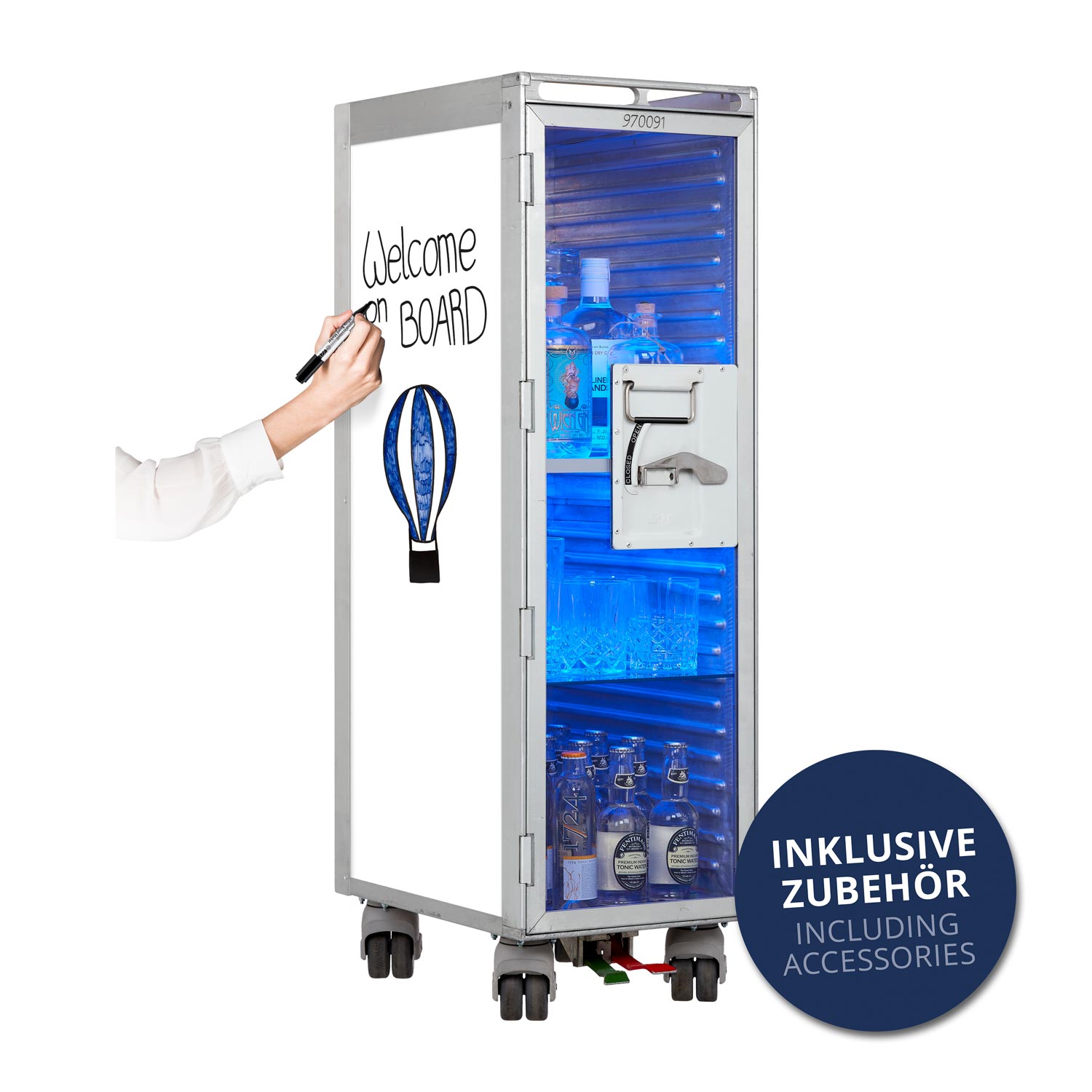 Der Whiteboard Flugzeugtrolley als Bar zeigt sich zeitlos elegant und lässt sich zudem mit Whiteboardmarkern beliebig beschreiben. Ob als mobile Cocktailbar oder kreative Minibar im Office, dieser leuchtende Trolley sorgt garantiert für Aufsehen.