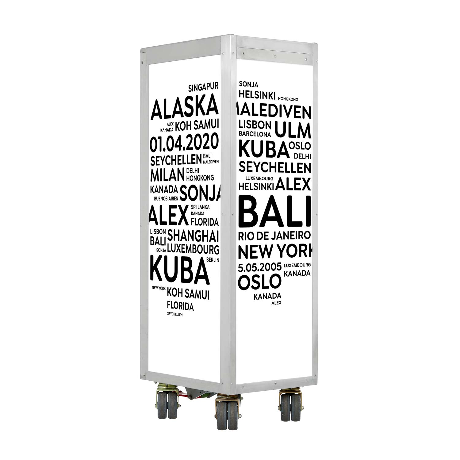 Dieser Flugzeugtrolley trägt Deine ganz persönliche Handschrift. Du wählst die Städte und Begriffe für das City Design aus und wir übernehmen alles Weitere. Ob Haupt-, Klein- oder Geburtsstadt, Hochzeits- oder Geburtsdatum, Lieblingsmusik, Spitznamen oder Meilensteine - wir designen nach Deinen Vorgaben Dein individuelles City Design.